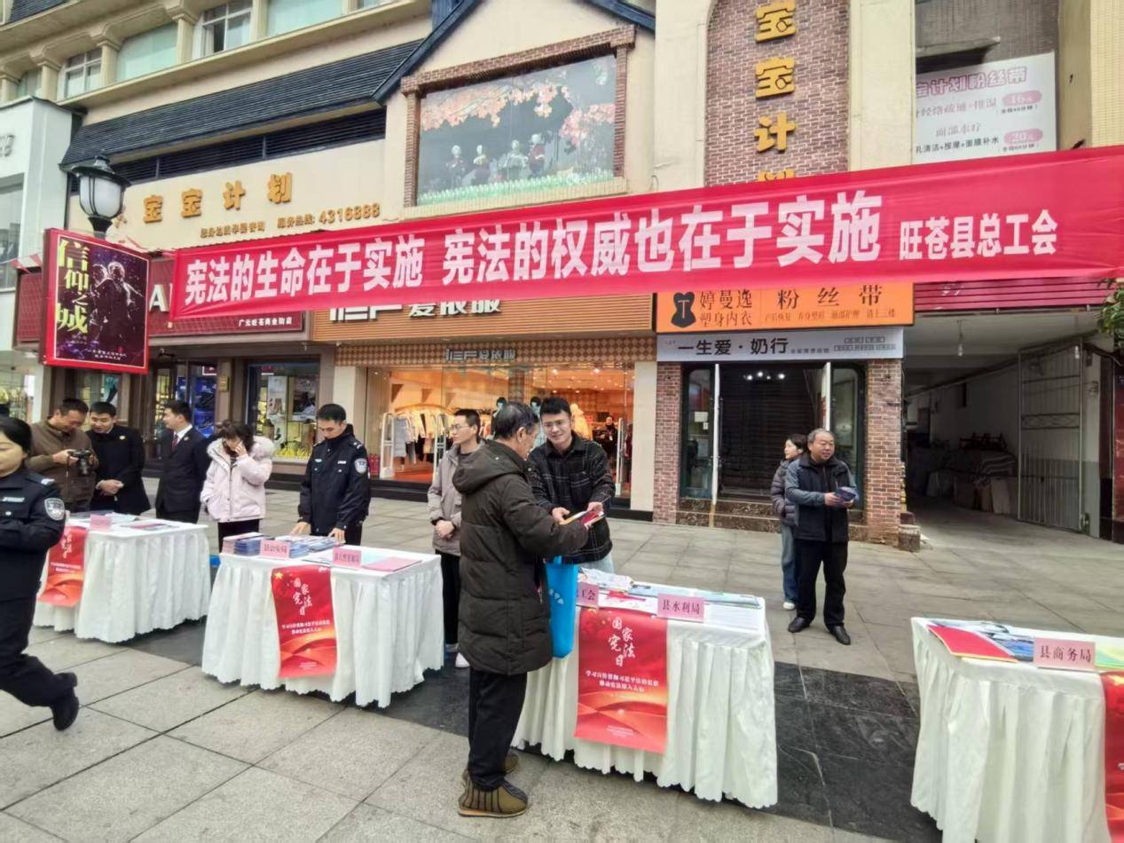 为更好地推动宪法知识走进职工群众身边,旺苍县总工会在电影院步行街广场设立普法宣传点,通过悬挂横幅、发放宣传资料、现场答疑等形式,向职工群众普及宪法知识。活动累计发放《宪法》读本、工会法手册等宣传资料200余份,接待职工咨询40余人次。